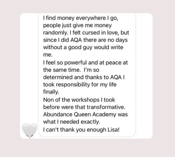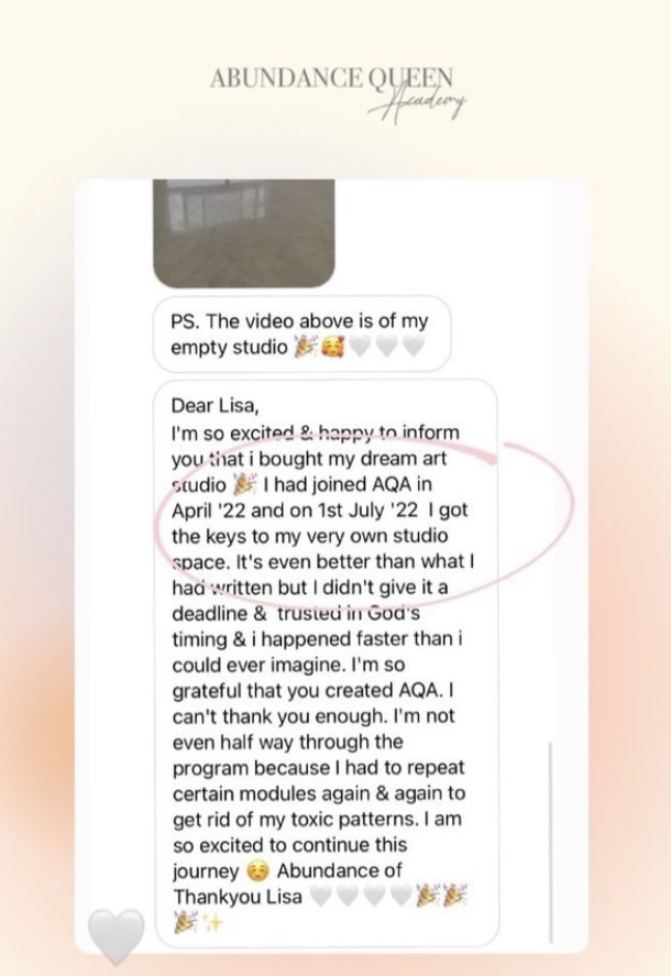 Integrity is one of my top values and I fully stand behind everything I teach inside Abundance Queen Academy.